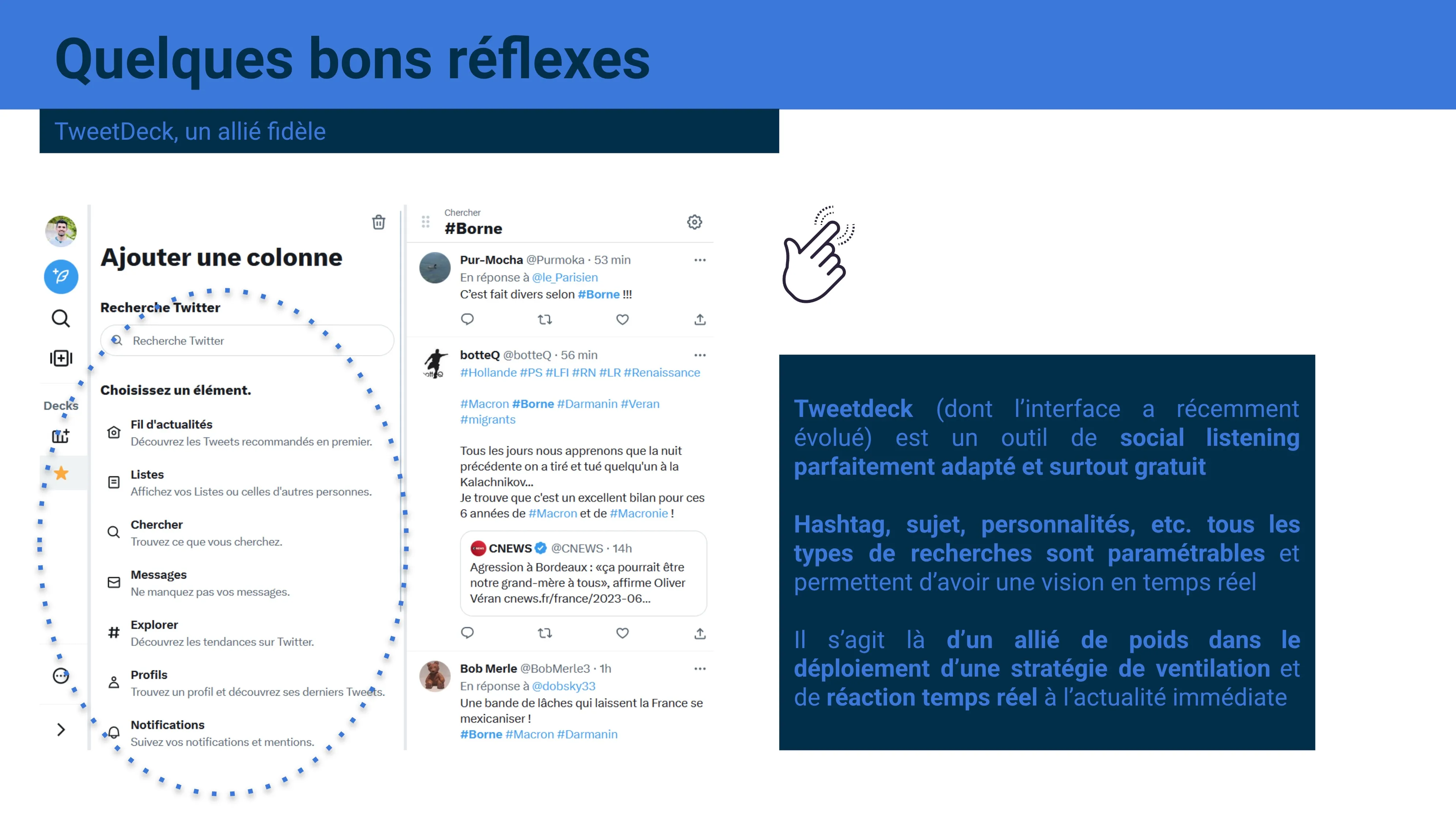 - présentation des activités social media aux équipes produit, retail, recherche qui peuvent être des sources d'histoires.